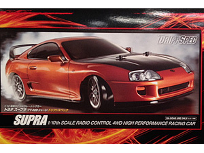A wellrecognized Japanese sports car around the world is the Toyota Supra. Leaving its mark both on the race track in the hands of pro drivers and on the streets in the hands of enthusiasts. Tamiya brings this well-known machine in the form of a Drift Kit on the TT-02D Drift Spec chassis. The TT-02 chassis is an entry level 4WD full independent suspension assembly kit that offers ease of assembly and easy maintenance. The TT-02D is the Drift Spec variant that includes special parts to make it a fun to drive drifting machine. Features: This is a 1/10 scale R/C model assembly kit. The aggressive form is captured faithfully by the polycarbonate body. Features separately-molded side mirror and rear wing parts. Carbon sticker for hood and rear wing included. The TT-02D is the specially tuned drift spec of the popular shaft-driven 4WD entry chassis, the TT-02. Features 24mm width drift-spec tires on metal-plated mesh wheels, CVA oil dampers, full ball bearings, a sport-tuned motor and aluminum motor heat sink. Instruction manual and sticker sheets included. ESC included. Required for completion; 2 Channel Radio System, 1 Servo, Battery and Charger, Polycarbonate Paint for the Body, Tools for assembly.
