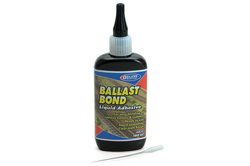Ideally suited to easy bonding of railway ballast & scatters, with rapid spreading and offering a clear matt finish. Deluxe Materials’ Ballast Bond is a ready to use, super thin, instant wetting liquid adhesive supplied with a Roket applicator tip for precise application.