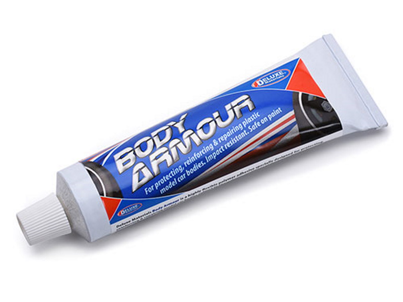 Deluxe Materials Body Armour is a highly flexible polymer adhesive specially designed for reinforcing & repairing model car bodies subject to the arduous conditions of model car competition. Its dries flexible making it ideal for protecting & repairing splits in model car bodies. It bonds most car body plastics including Lexan, polycarbonate & styrene & will not attack most common model car paints.