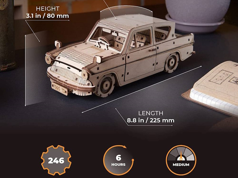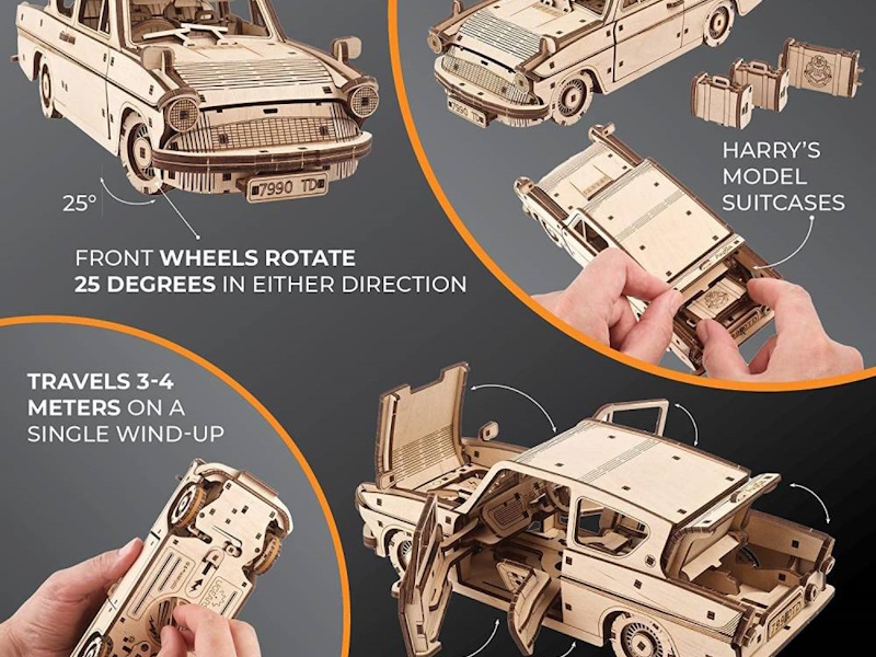- YOU’RE IN CHARGE OF MAKING IT FLY: The Flying Ford Anglia car is here to rescue Harry Potter from missing the start of the school year at Hogwarts and delight all UGears fans. This wooden car model can ride on any flat thanks to the grippy rubber band tires