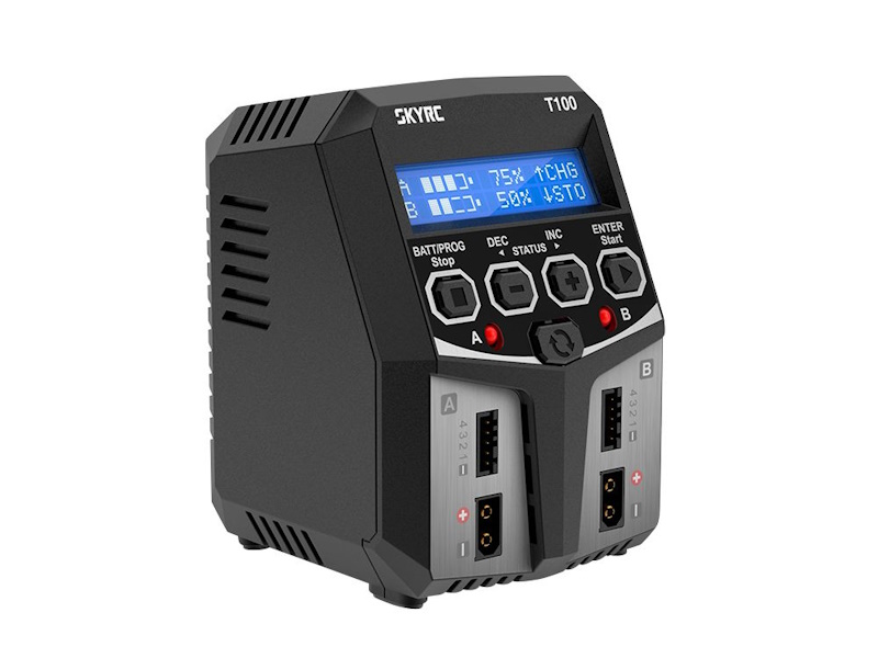 SkyRC T100 is a twin-channel charger with two independent circuits which can charge batteries of varying chemistries (LiPo / LiFe / Lilon / LiHV / NiMH / NiCd / Pb) simultaneously. Its sleek design allows easy front-loading plug-in convenience of balancing and XT60 ports. It is not only compact in size but also powerful in output with maximum 100W charging power and 5A charging current which makes charging more sufficient. With the new AGM and cold charge modes, the user is free to charge their PB and AGM batteries in cold days.